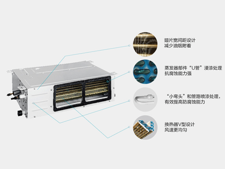 廚享內(nèi)機(jī)采用金色防腐翅片換熱器,抗腐蝕能力強(qiáng),翅片采用寬間距設(shè)計(jì),可減少油煙附著:換熱器采用V型設(shè)計(jì),使風(fēng)速更均勻。 |